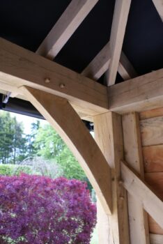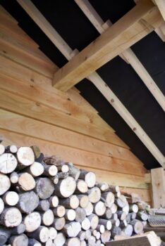 Further on the right hand side of the building, a side log store area has been created within a section of the half bay. The design of this is emphasised by the catslide roof running down to the rear.