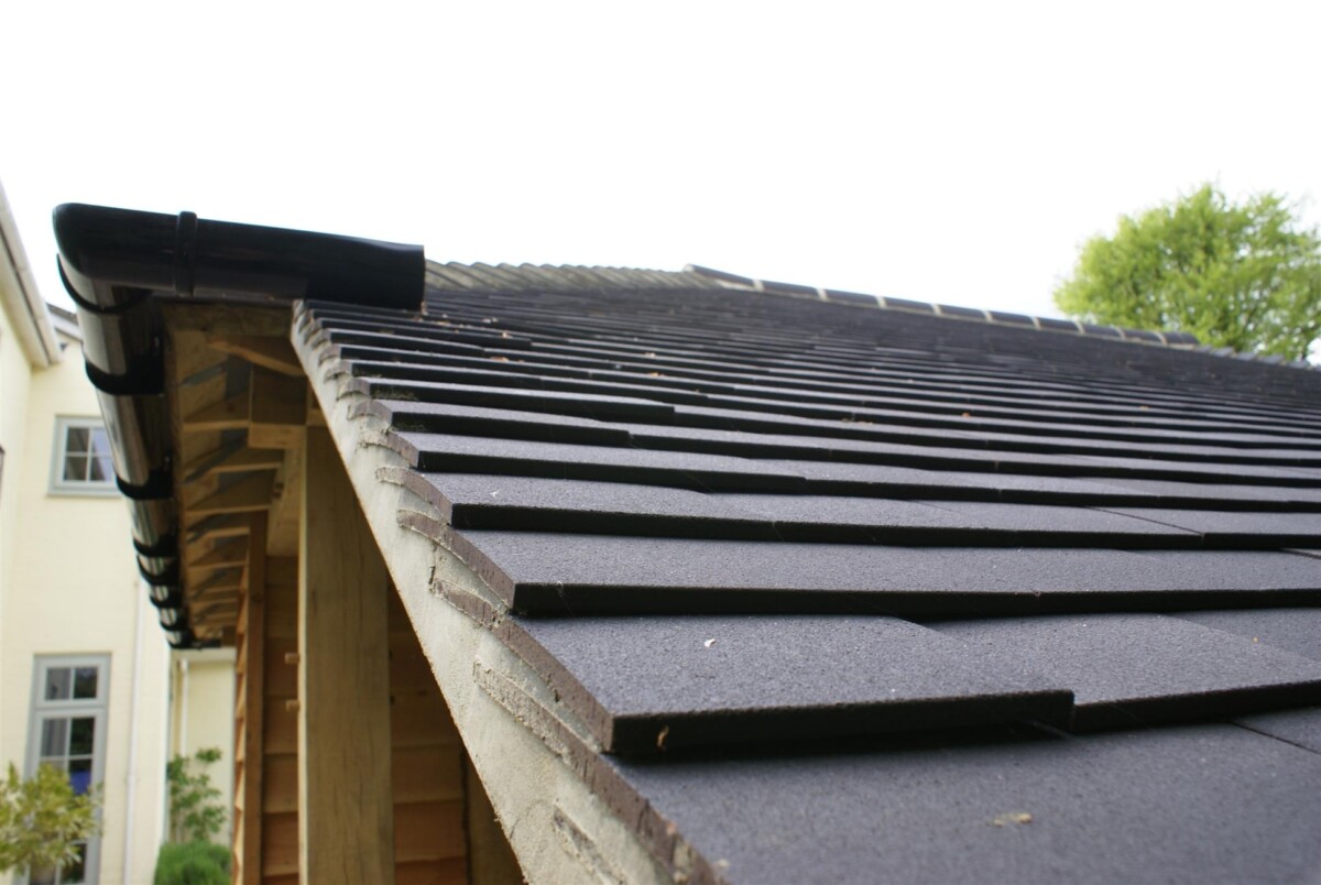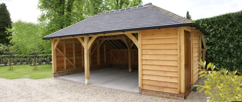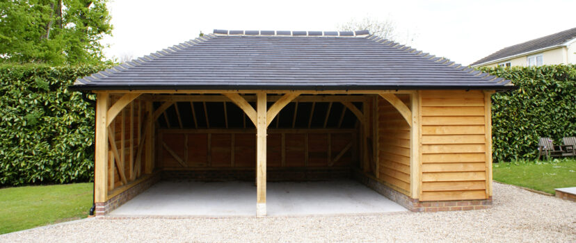 This two and a half bay catslide oak frame garage garage uses softwood studwork with Larch weatherboarding and a fully hipped roof comprising of machine made marley staff blue tiles.