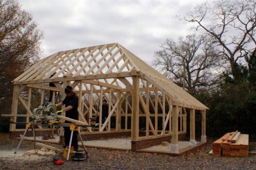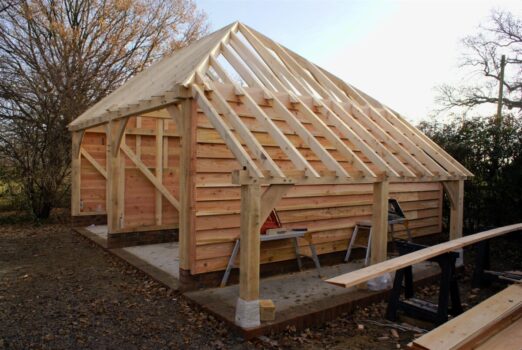 This 2 bay garage was a great local project where our teams were involved with every facet from the get go including groundworks, manufacture, assembly & roofing. The full hip barn hip roof looks great with the log store addition.