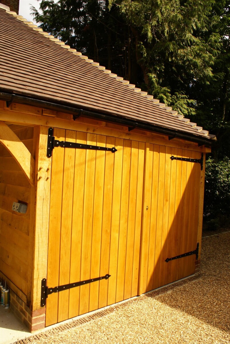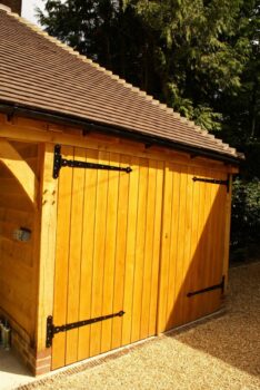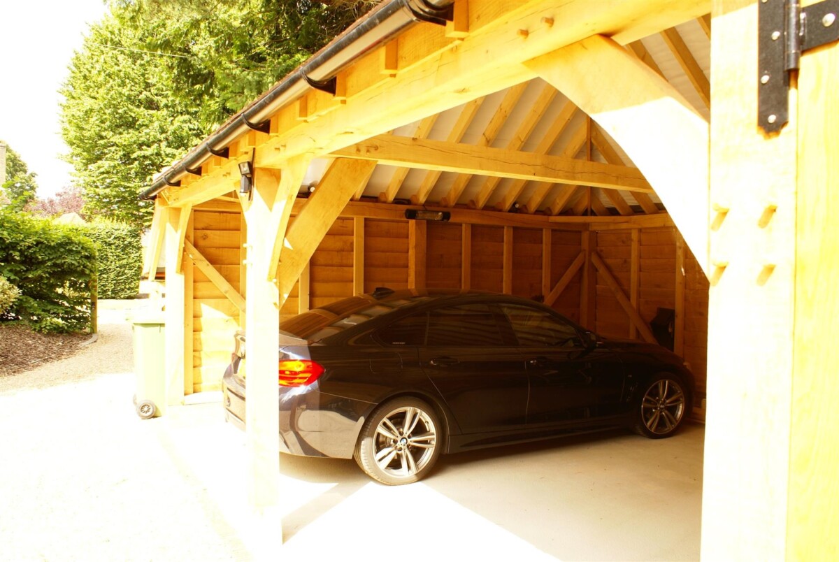 One of the bays has a partition and set of oak doors for a secure section of the garage whilst the other two bays have been left open for easy access in and out. Externally the building has been fitted with oak weatherboarding and internally, sensor lights have been installed.