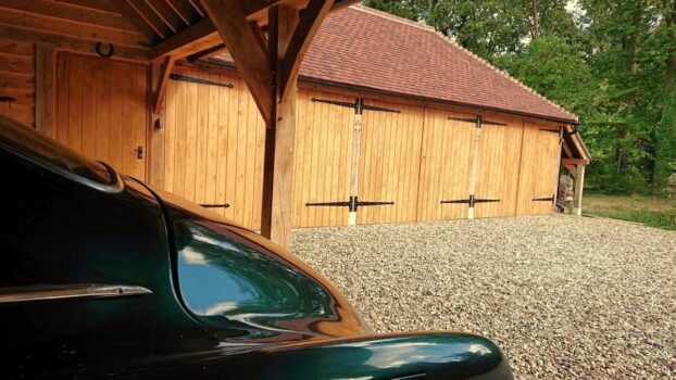 This L shaped building incorporates 6 garage bays as well as a workshop, log store and drive way into a 15.4m x 15.4m area. Further storage opportunities can also be used due to the large vaulted ceilings of this building by creating floors above the garage bays which are commonly accessed through an internal stair case or drop down ladder. A fully hipped roof on each end of this L-shaped oak framed building has been used. This works very well with a log store as can echo the fully hipped roof, this can be seen on the right hand side of this building.