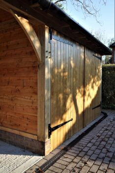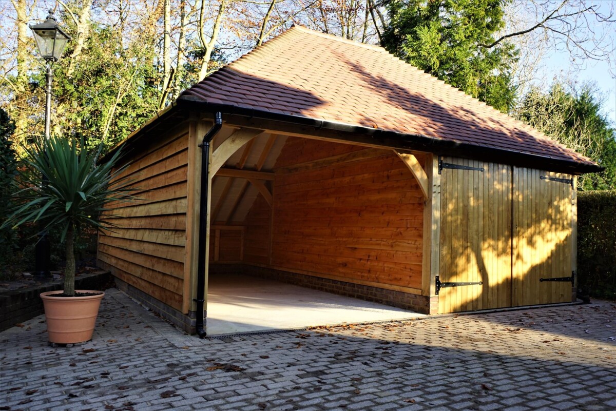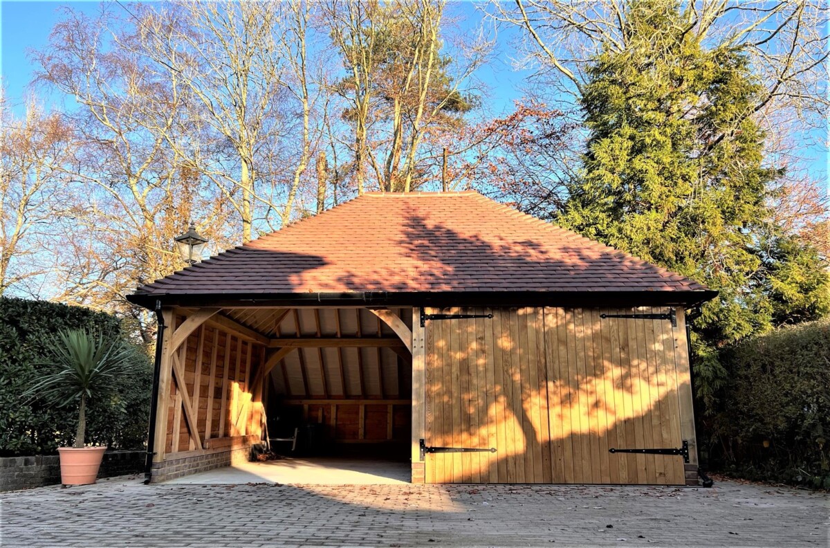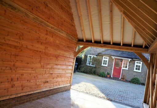 The left hand side bay has been left open and the right hand side bay has a pair of handmade oak garage doors creating secure storage. Larch weatherboard has been used on this building which looked great on this crisp sunny morning. As the building ages the colours will soften and the frame & weatherboard will start to silver.