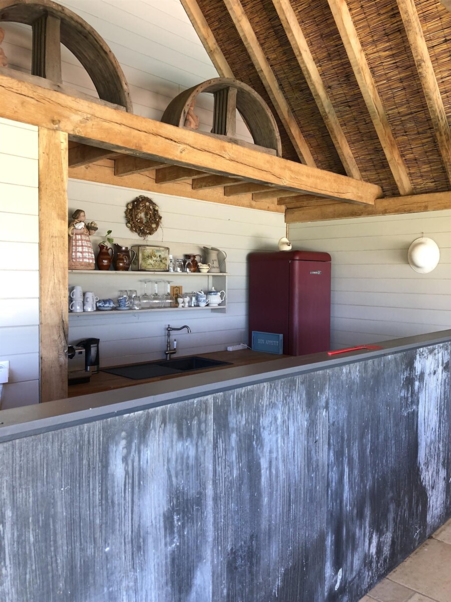 The rustic style outdoor kitchen has been complimented by the silvering of the oak weatherboard and oak frame offset by aluminium guttering running around the building in this sun trap by the pool towards the end of the garden. This multi-purpose building was supplied by The Oak Designs Company in kit form to our clients and was erected in the country side of the south of France. The beauty of these oak frame eco-friendly outbuildings like this is that they suit and enhance their surroundings so well, oozing in charm as well as adding a lot of value onto a property.