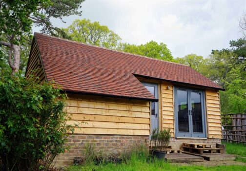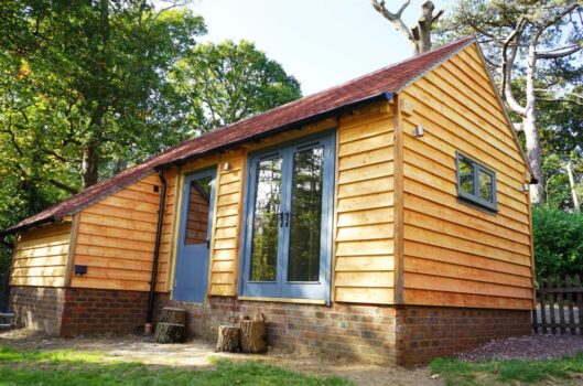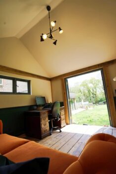 The other side of the building where the full span shapes continues, a home office has been created with double casement full length French doors which lead out onto views of the garden giving easy access a few metres away to the side of the house & kitchen. A mullion & double casement window lend a hand in bringing lots of natural light into this building, whilst the vaulted ceiling and full length French doors also help create an enviable feeling of space and luxury, working from home with views out onto the garden.