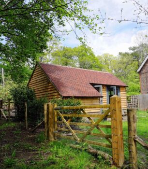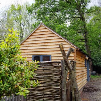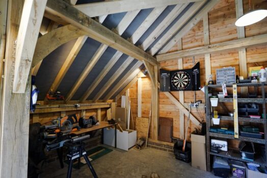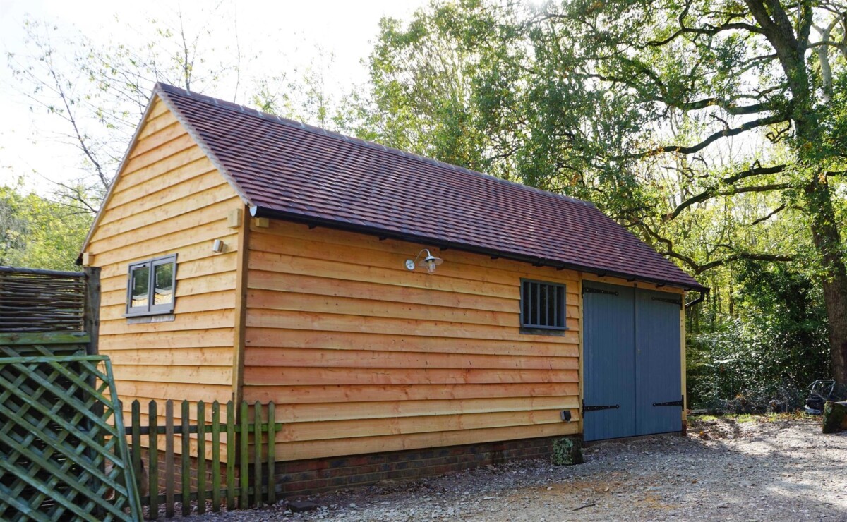 This building uses a combination of the catslide & full span shapes to help create a multi-functional building within a minimal footprint. The catslide garage to the rear allowed for a garage space which was used for storage as well as a workshop area with access from the drive via a pair of softwood garage doors painted in a slate grey. This space then opens up to the full span shape which allows for a small space including a bike store to the left with a personnel door behind leading out onto the garden.