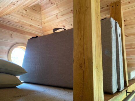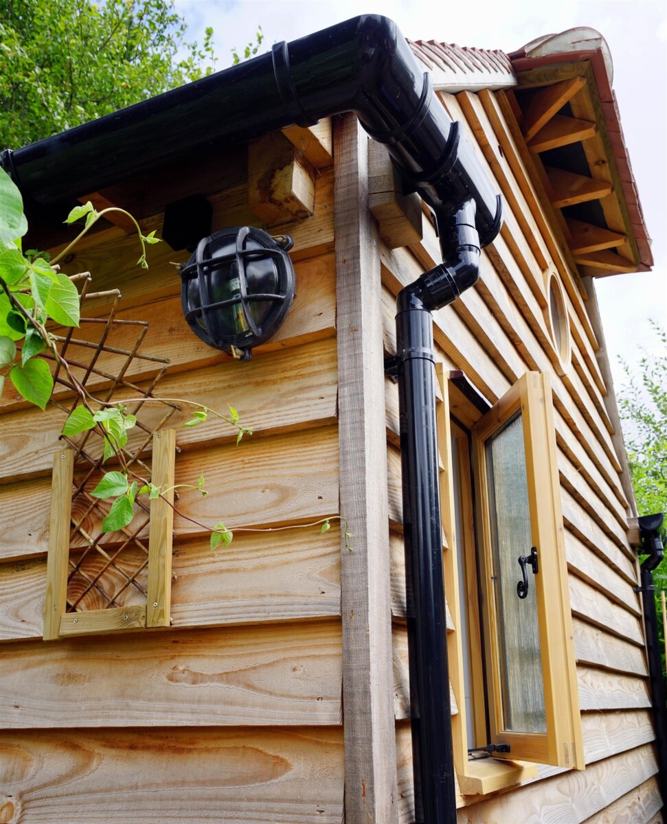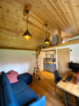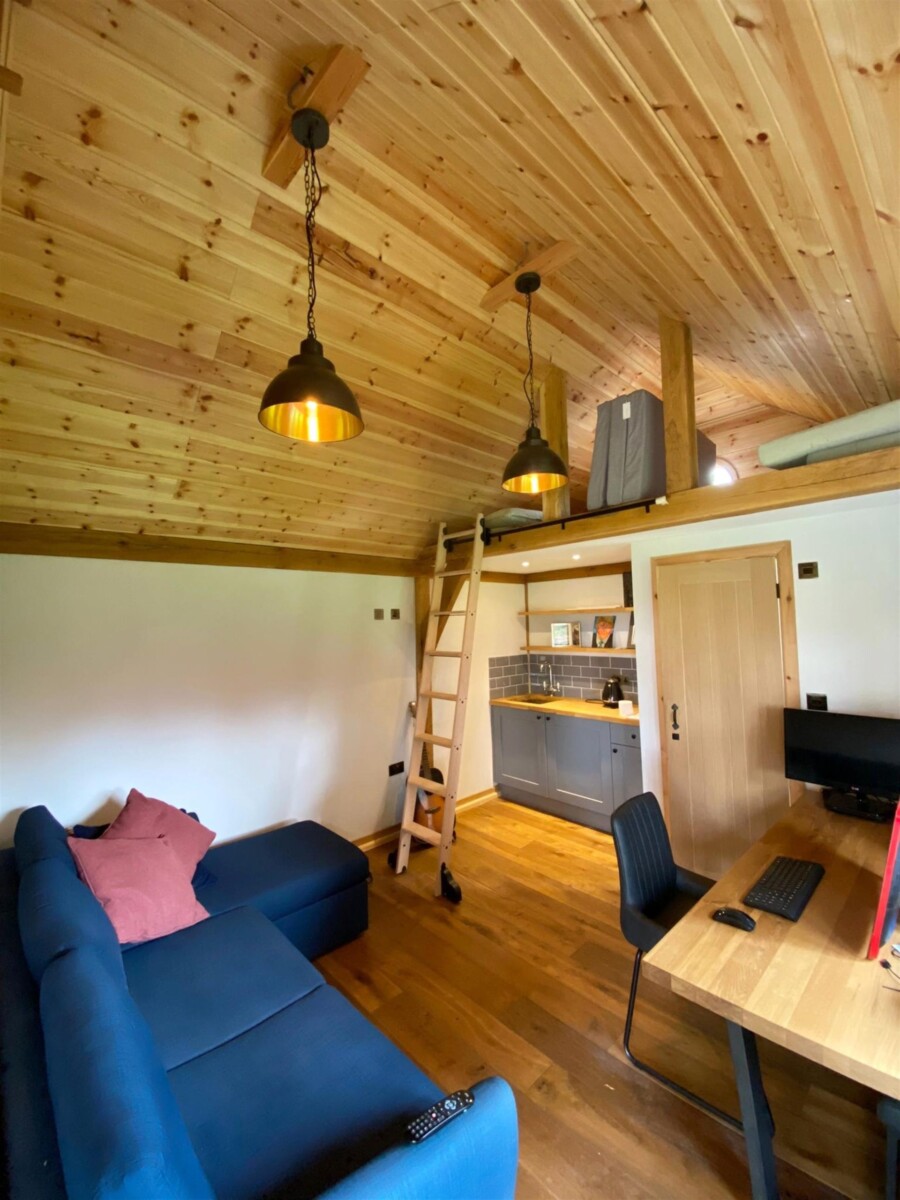 The Office space has been done to a habitable dwelling spec including use breather membrane and top of the range insulation. The rest of the internal fitting out is normally the responsibility of the client and their contractors as you can see they have done a great job and have managed to create a multifunctional use with this frame design. 3 different windows have been used in the manufacture of this building. these include 1 triple casement window with one fixed pane and two openers. There is a single casement window that opens out from the ensuite wet room as well as a custom made circular window at the very top off the building.