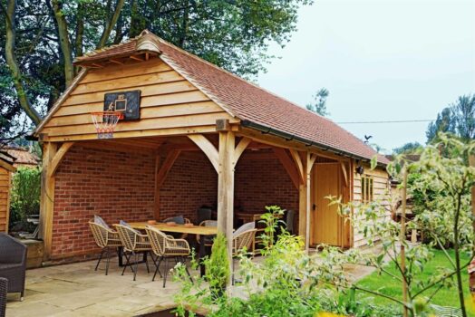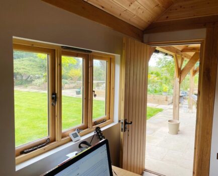 This fullspan shaped oak framed building includes an undercover outdoor entertainment area and a habitable dwelling space for a home office. This building combines a gazebo design with a home office allowing the building to be used for both business & pleasure.