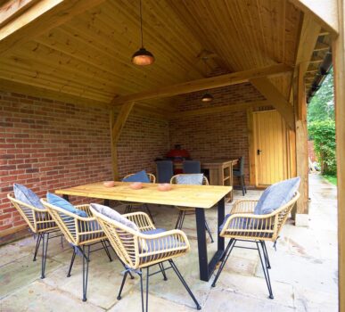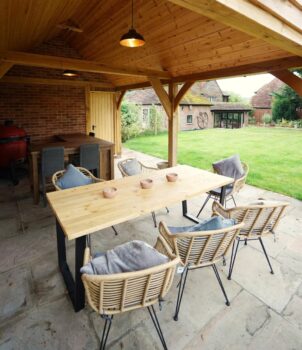The outdoor entertainment area is open sided on two sides, similar to our oak framed gazebo & car port buildings. This provides an ideal space to look out onto the garden and enjoy some alfresco dining. Our clients have clad the ceiling in pine and put in some external lighting to create a bar and BBQ area as well as a seating & dining area that can be used rain or shine all year round. Between the framework internally in this area brickwork has been used instead of stud work and weatherboard on the rear internal wall and again on the side wall of the office area.