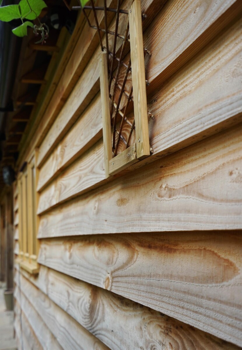 A barn hip roof has been used on both ends with clay Penshurst tiles. Timber wise, larch weatherboard has been used and externally you can see how the larch weatherboard and oak frame are starting to silver with age from U.V. exposure.