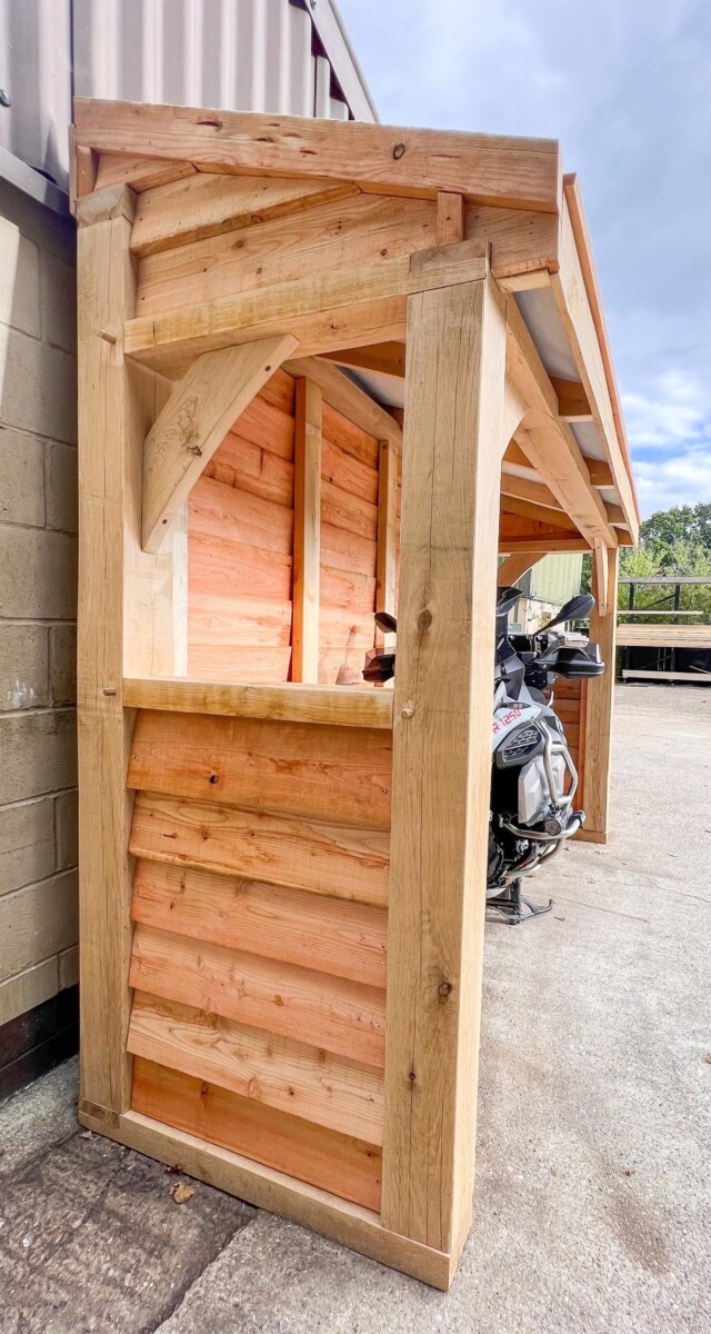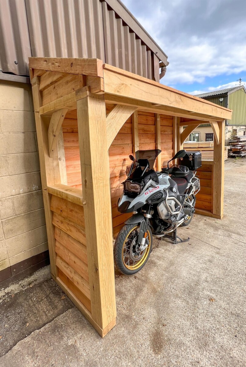 This oak frame structure not only adds value but allows properties to utilise this usually wasted space. This particular model has been designed & built for bin storage but as you can see a large BMW R1250 GS Adventure has currently taken ownership to stay out of the rain. If wanting to utilise this structure for a nice outdoor kitchen/BBQ & bar area we would recommend increasing the height and depth to give more space & make sure when BBQing you’re nice and dry whatever the season.
