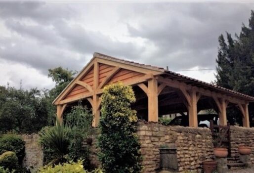 These photos were kindly sent in by one of our customers. Similar to an oak frame garage this full span shaped structure provides a vaulted ceiling but has a reduced roof pitch supported by independent posts and is open to the front rear and sides. This type of building is commonly referred to as an oak framed car port.