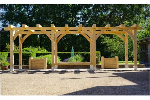Independent oak posts sit on hand made saddle stones. This oak pergola frames the garden when you drive into the property it also acts as a walkway from the garage and workshop to the rear to the property and additional gardens. This garden structure will silver from the sun and meld into surrounding even more as it ages.