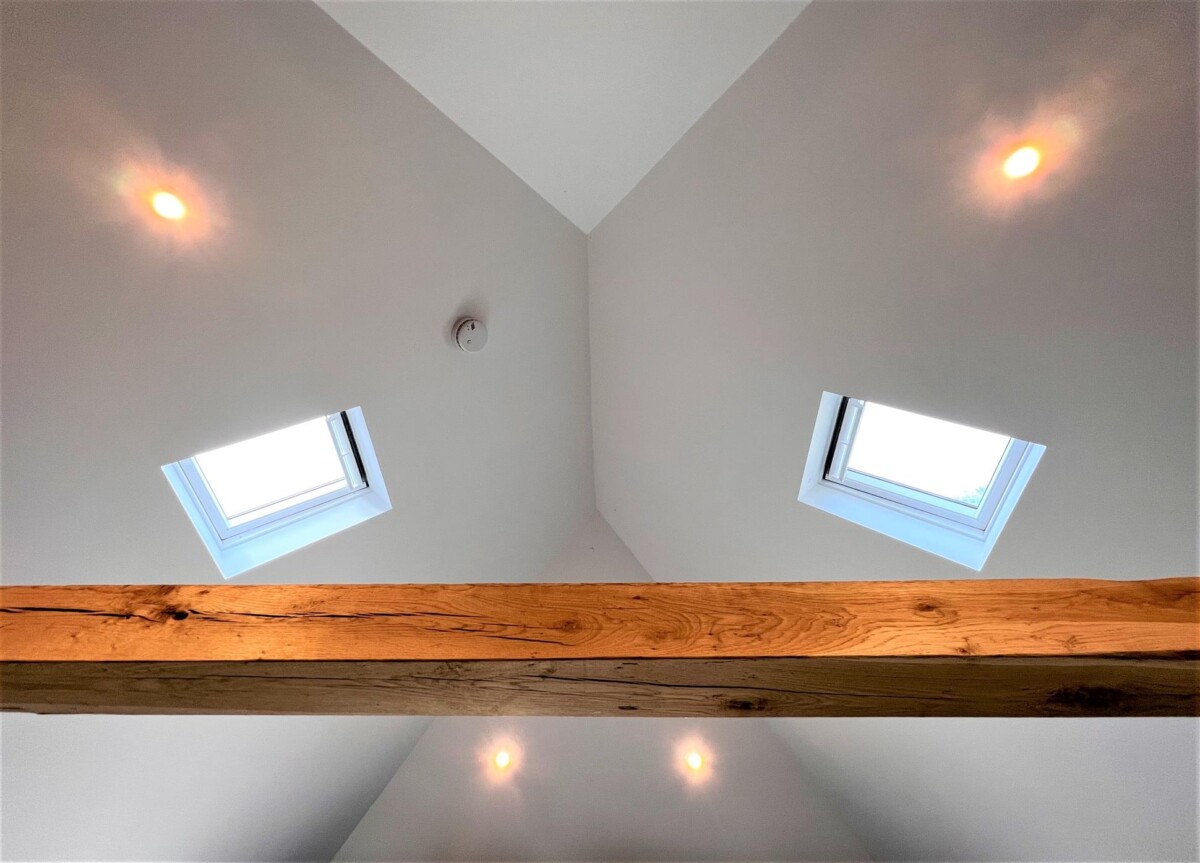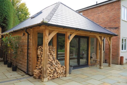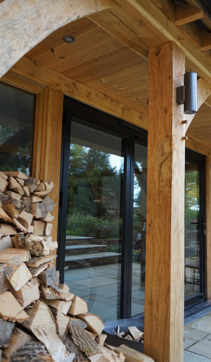 The Foleigh is a habitable spec outbuilding which has been designed to bring in lots of natural light and maximise the views out through the front of the building with large spacing between the oak posts, aluminium bi-folding doors and Velux windows in the vaulted ceiling.