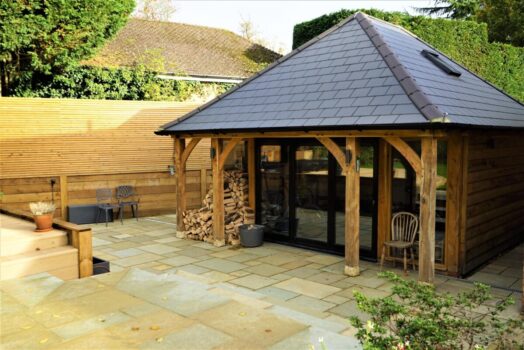 A front porch has been designed which is an excellent feature to this outdoor living building as it gives shelter from the elements and makes the building more practical throughout the seasons to open up for air flow letting the outside in when opening up the large bi-folding doors, ideal when internally it is being used for a home gym & sauna. The front porch area also provides a space ideal to store firewood and taking a pair of muddy boots off, after a long wet walk.