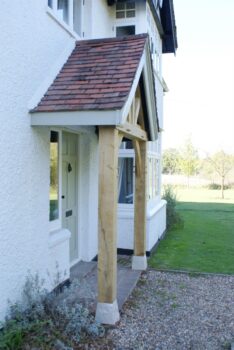 This simplistic yet stunning oak framed porch utilises 175mm x 175mm oak posts and tapered saddle stones. This porch replaced an existing structure and front facade whilst keeping the existing roofing structure and saving the cost of having to redo this element.