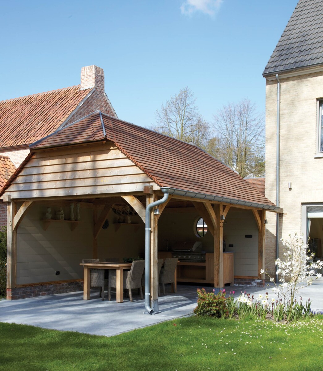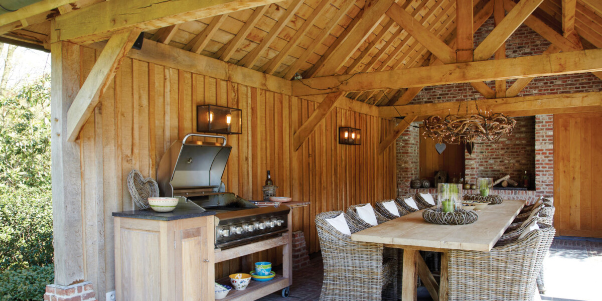 The oak framed building provides ample space for dining, and can be fitted out to rival the most lavish indoor cooking areas complete with stainless steel appliances, fridge / freezers, granite worktops and sink units. Dine al fresco – enjoy a bottle of wine even when it’s raining or windy. For enhanced pleasure, why not add spotlighting and infra-red heating?